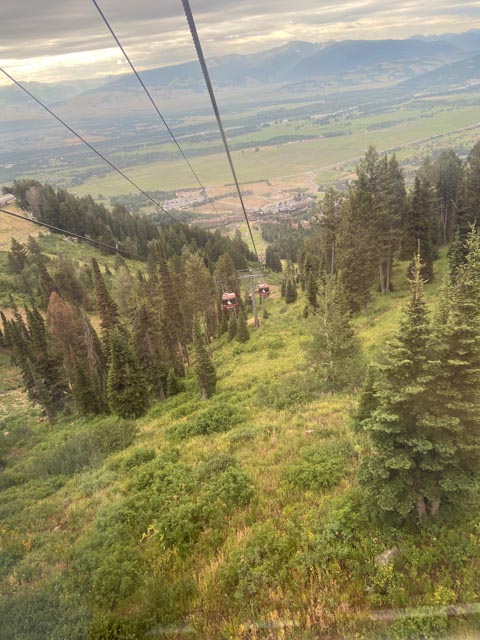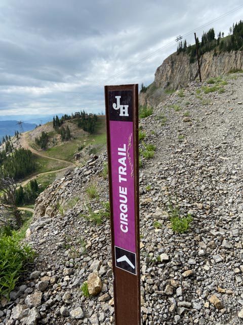 But, first, we decided to park the vehicle up at the end of the trail where we would be coming out. We hitched a ride back to the Teton Village to catch the Gondola to up 8500 feet before we started our hike. We started at the Cirque trailhead just beyond the small building where others were doing yoga. We made our way across the side of the mountain with several switchbacks to one of the highest points, around 10,400 at 2 miles to the top.